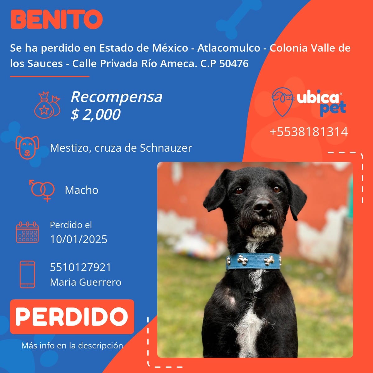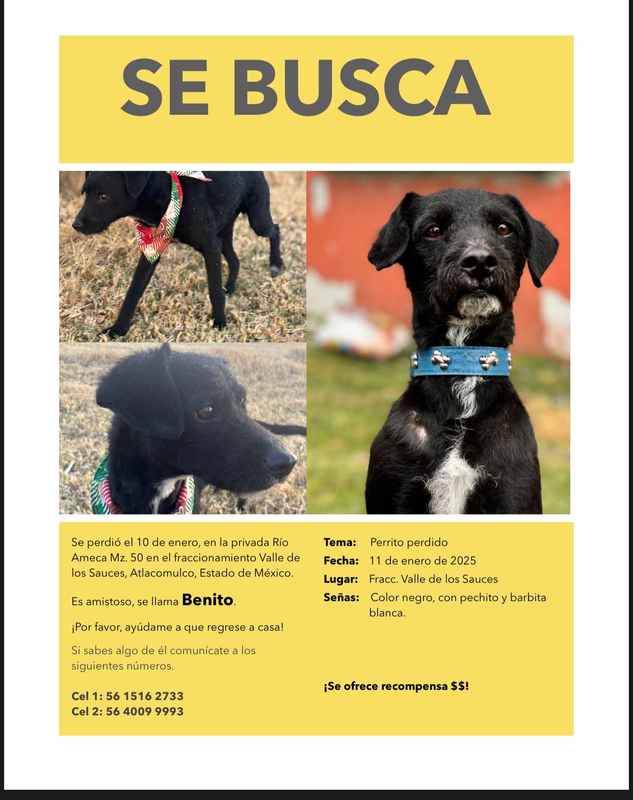 Cualquier infotmacion que tengas de el, favor de llamar al numero 5510127921