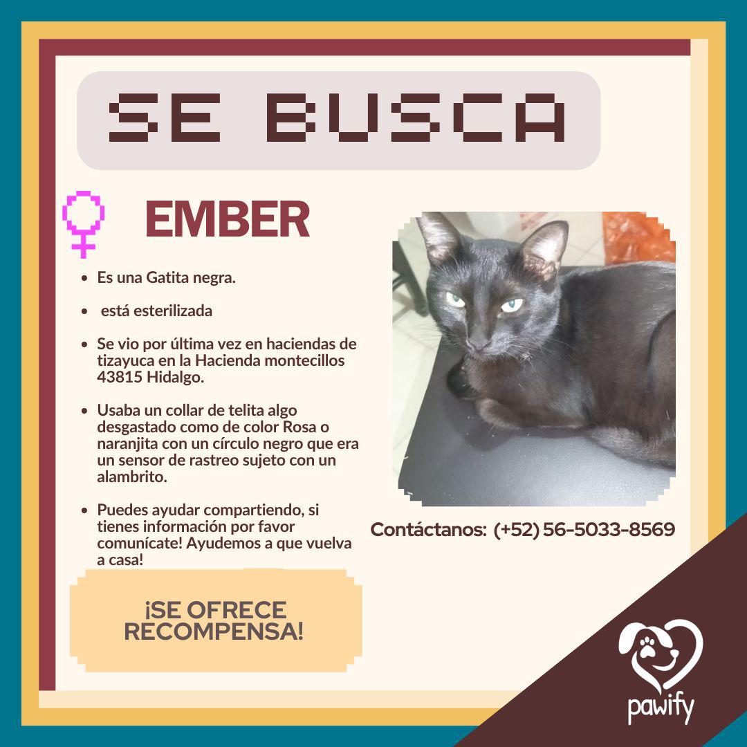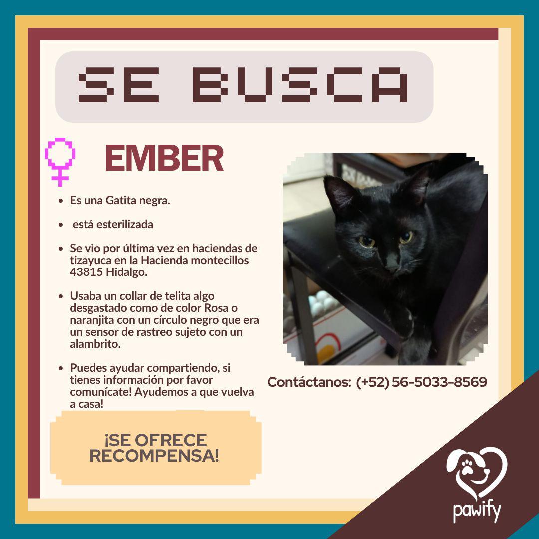 Gatita Negra, su nombre es EMBER, es gordita, tiene un collar de tela ya algo desgastado de color rosita o naranja, en el collar trae colgando un armazón circular de color negro que era de un rastreador mordizqueado el cual viene sujeto con un alambrito.