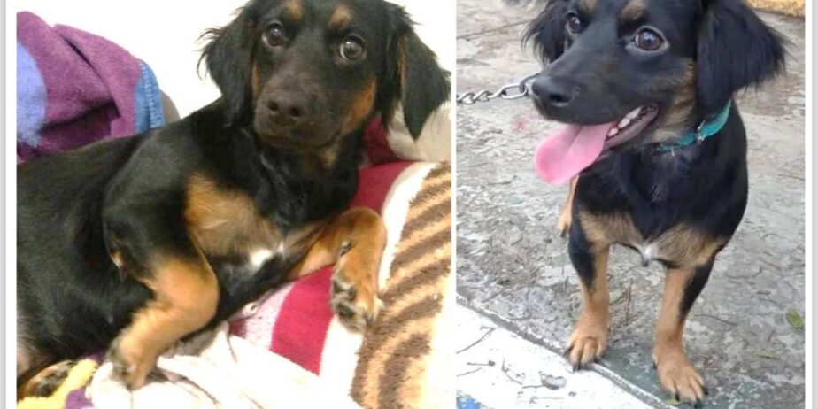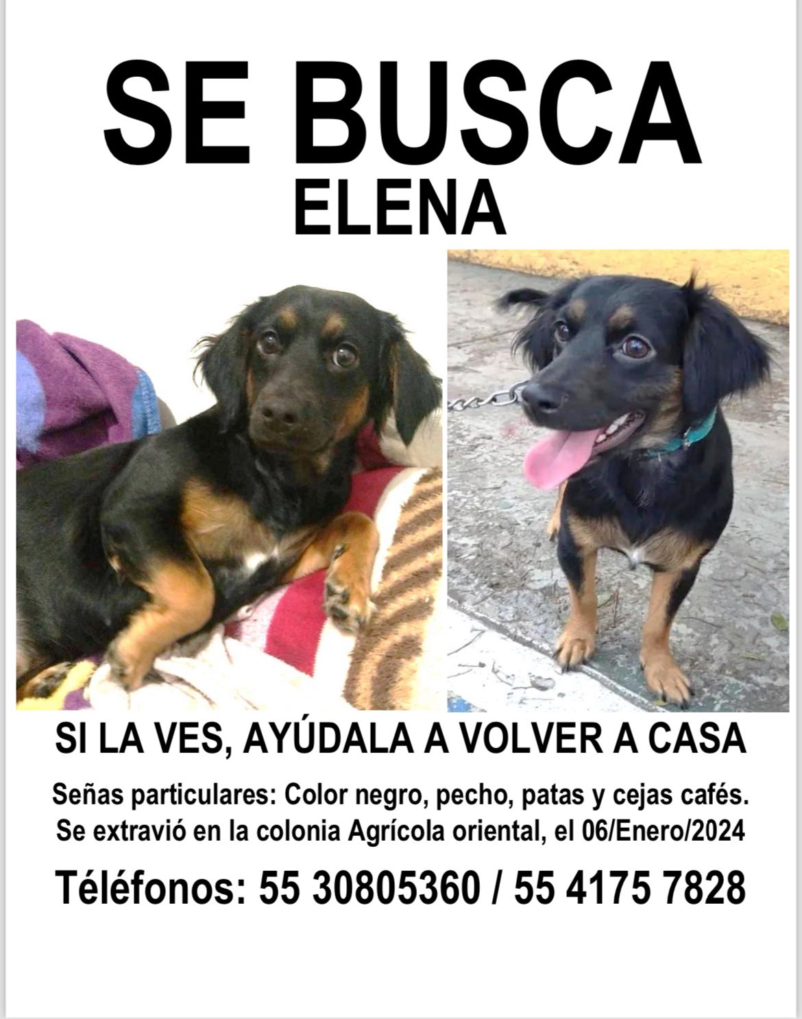 Ayuda a Elena a volver a casa Tiene pelo negro, con pecho, patas y cejas cafés. Es cruza de salchicha con orejas peludas