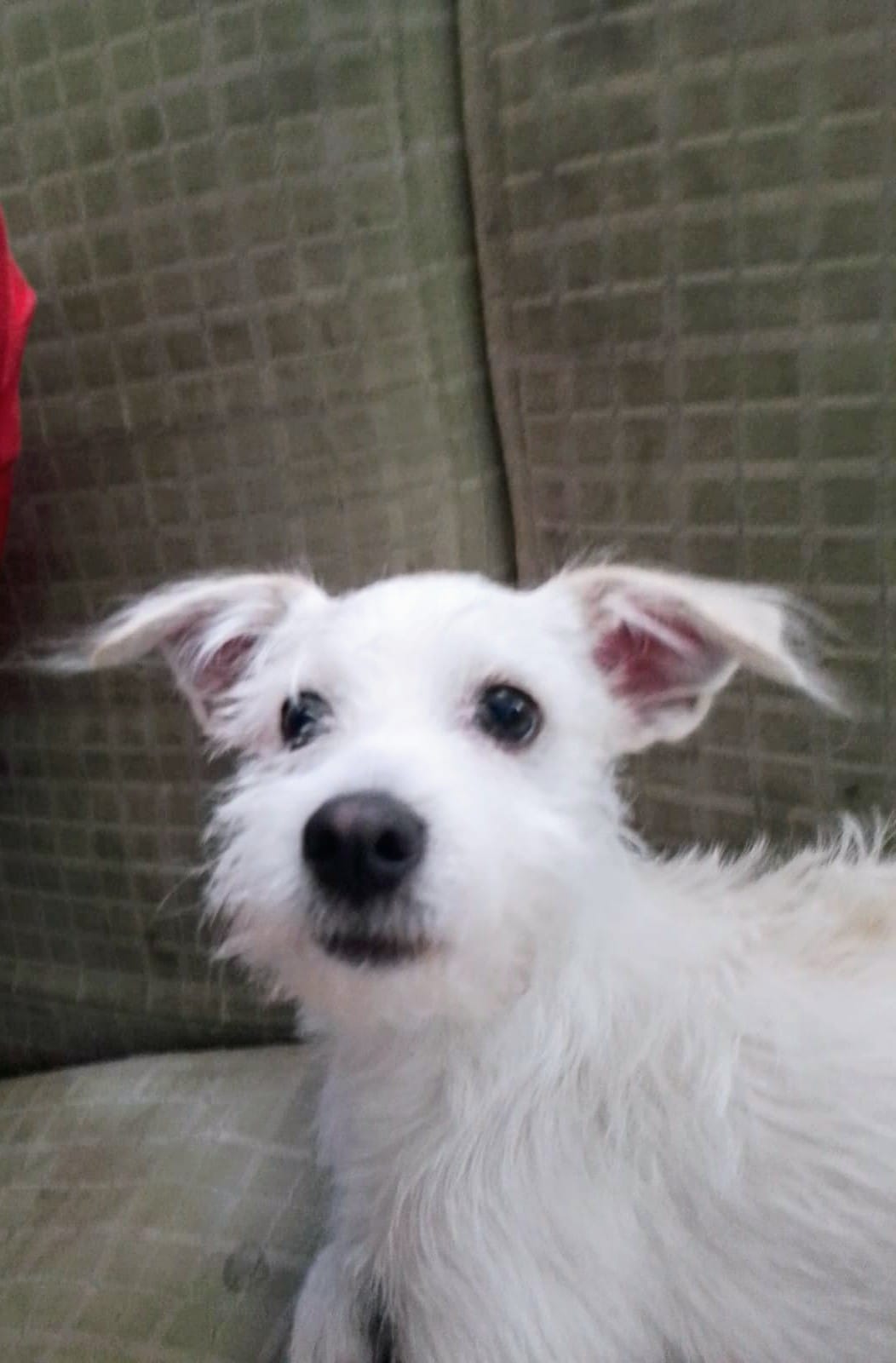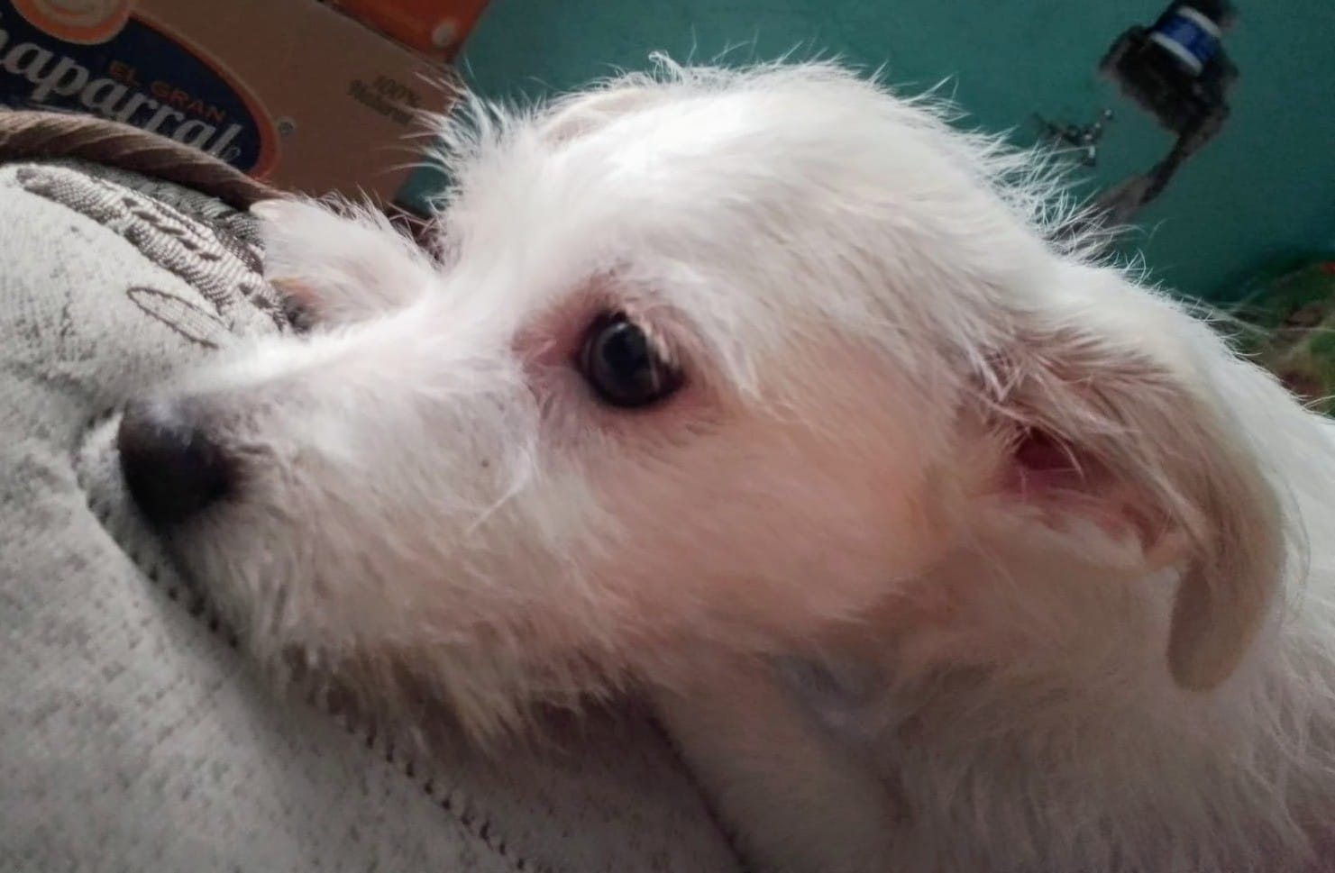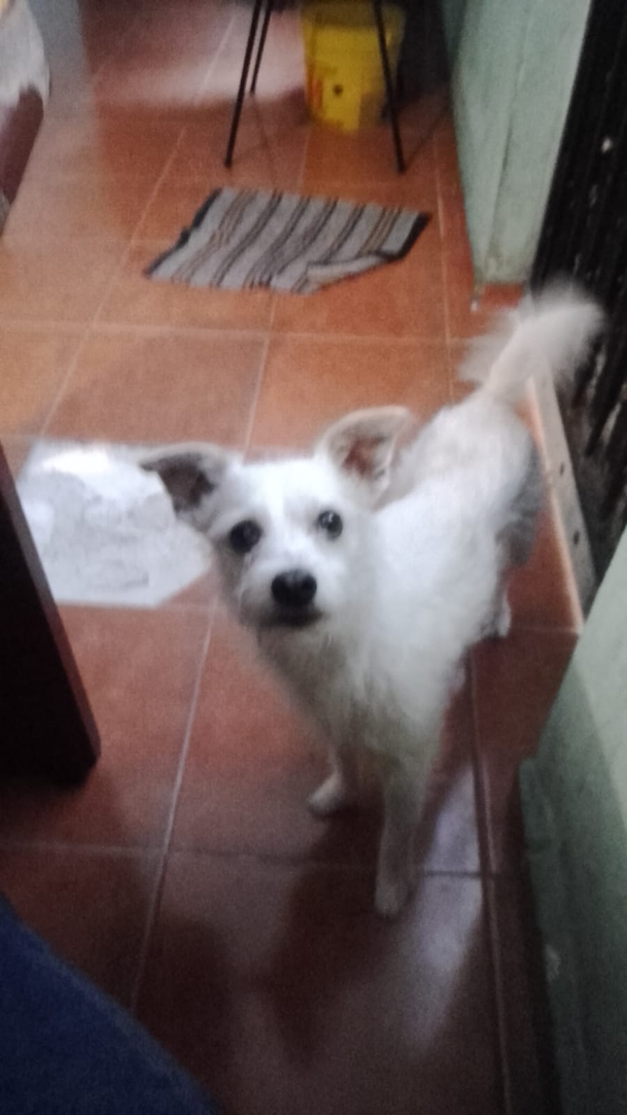 Es de Baja estatura totalmente blanco tiene herida pequeña en la pata delantera al hablarle levanta orejas. Responde al nombre de tobi